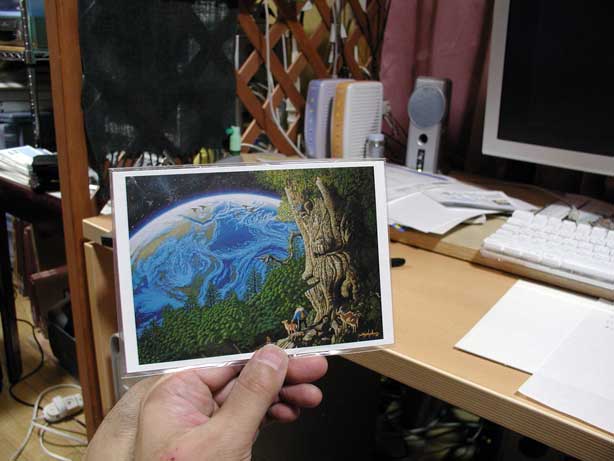 新聞記者さんは『青い星の奇跡』を非常に気に入ってくれて、『この絵を毛利さんに見せたら喜ぶだろうなぁ』と言いつつ、同じ絵柄のはがきを何枚か買って行ってくれたのです。