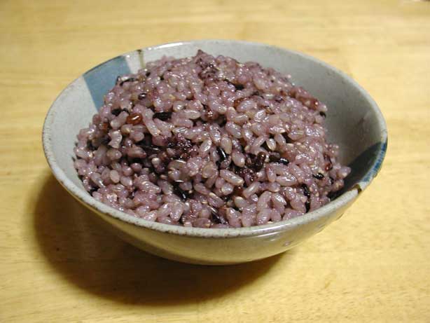 ご飯は発芽玄米です。あと、雑穀米と黒米を混ぜてるのですが、黒米を混ぜると、紫色のご飯になりますね。(笑)